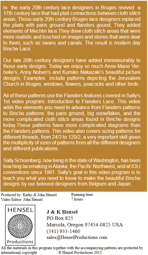 Sally Schoenberg, now living in the state of Washington, has been teaching lacemaking in Alaska, the Pacific Northwest, and at IOLI conventions since 1991. Sally’s goal in this video program is to teach you what you need to know to make the beautiful Binche designs by our beloved designers from Belgium and Japan.