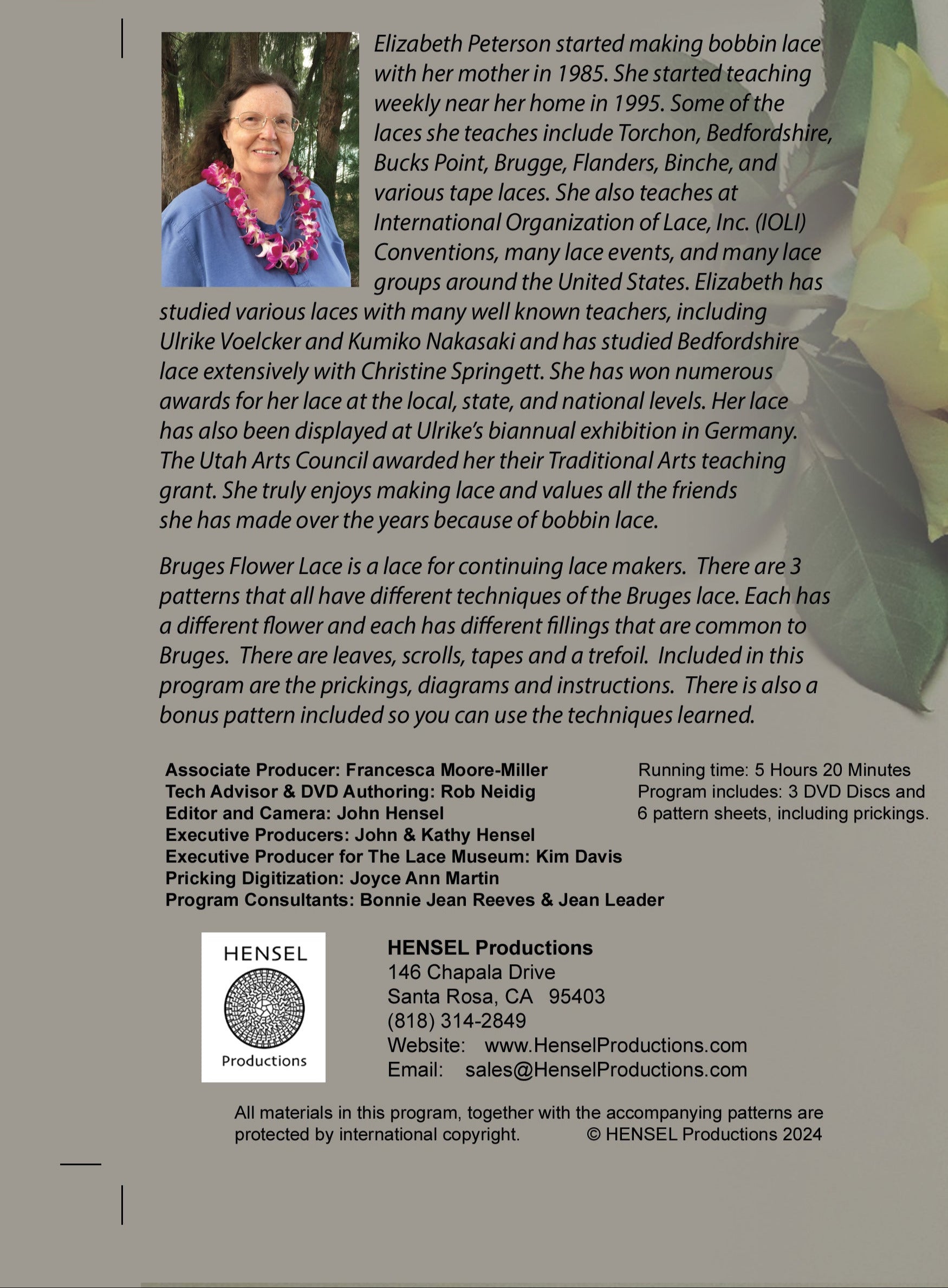 Elizabeth Peterson started making bobbin lace with her mother in 1985. She started teaching weekly near her home in 1995. Some of the laces she teaches include Torchon, Bedfordshire, Bucks Point, Bruges, Flanders, Binche, and various tape laces. She also teachers at International Organization of Lace, Inc. (IOLI) Conventions, many lace events, and in addition many lace groups around the United States. Elizabeth has studied various laces with many well known teachers, including Ulrike Voelcker, Kumiko Nakasaki and has studied Bedfordshire lace extensively with Christine Springett. She has won numerous awards for her lace at the local, state, and national levels. Her lace has also been displayed at Ulrike’s biannual exhibition in Germany. The Utah Arts Council awarded her their Traditional Arts teaching grant. She truly enjoys making lace and values all the friends she has made over the years because of bobbin lace..