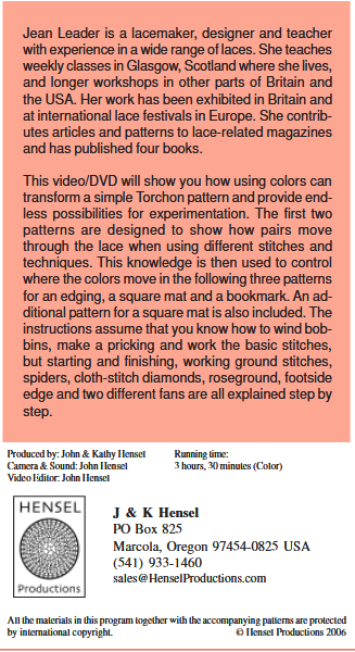 This DVD will show you how using colors can transform a simple Torchon pattern and provide endless possibilities for experimentation. The first two patterns are designed to show how pairs move through the lace when using different stitches and techniques. This knowledge is then used to control where the colors move in the following three patterns for an edging, a square mat and a bookmark. An additional pattern for a square mat is also included. The instructions assume that you know how to wind bobbins, make a pricking and work the basic stitches. However, starting and finishing, working ground stitches, spiders, cloth-stitch diamonds, roseground, footside edge and two different fans are all explained step by step.