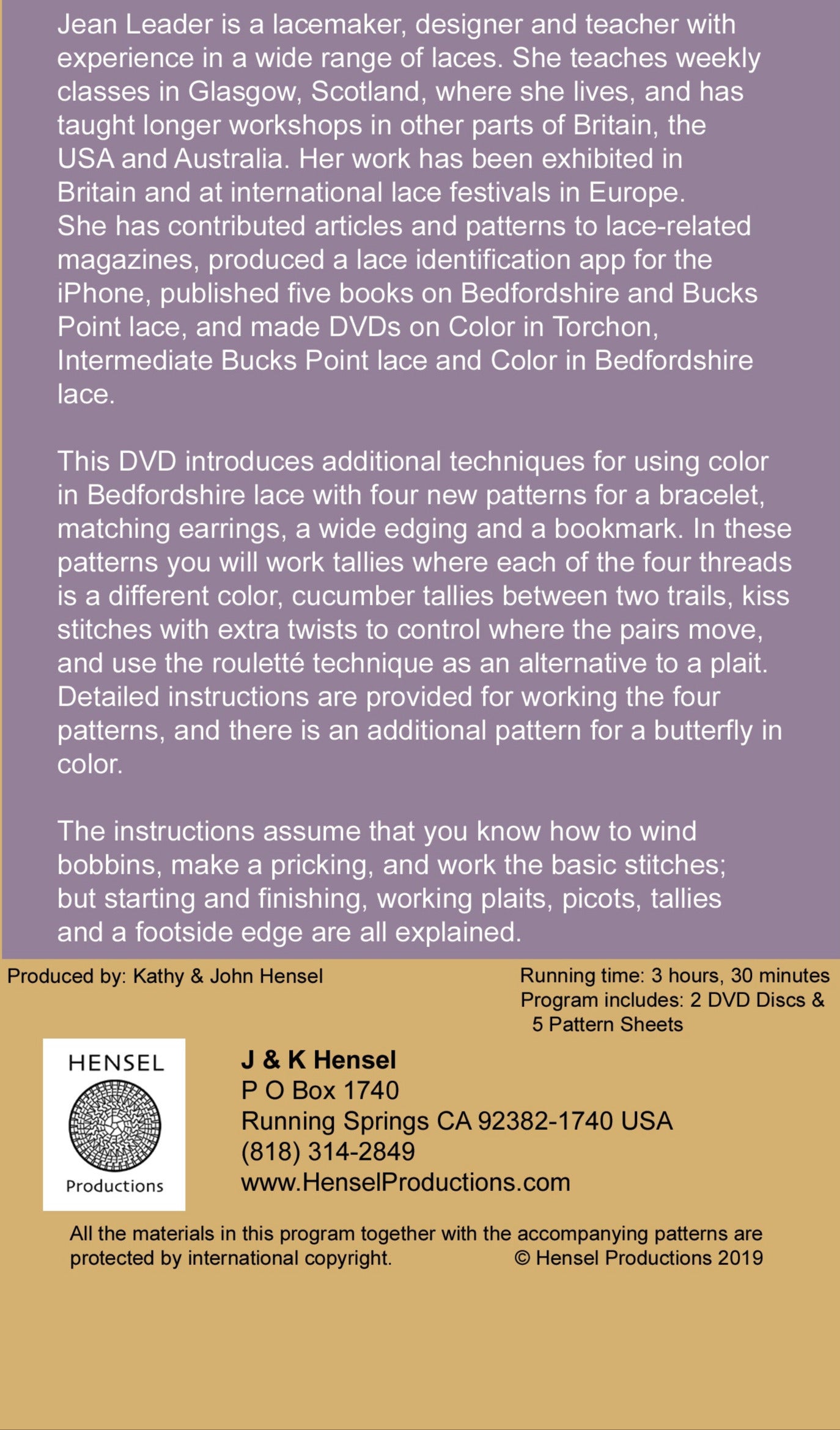 This program introduces additional techniques for using color in Bedfordshire lace with four new patterns; a bracelet, matching earrings, a wide edging, and a bookmark. In these patterns you will work tallies where each of the four threads is a different color, cucumber tallies between two trails, kiss stitches with extra twists to control where the pairs move, and use the roulotté technique as an alternative to a plait. Detailed instructions are provided for working the four patterns, and as always, there is an additional pattern for extra practice; a butterfly in color!