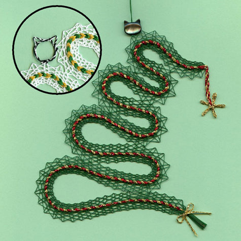 Course Description: Why is the Christmas tree toppling over? It was the cat. This discombobulated tree showcases some inlaid gimps designed and drawn by early Lace Museum member Kay Asahi and published in Exploring Inlay Gimp Variations. With the museum’s permission, we’ll try about three of the gimps from the book in the first session then once you choose your favorite we’ll start the tree in the second session. The cat hiding in the branches can be a bead or charm, available from Joan, or a cat-shaped plait that we’ll make in class.