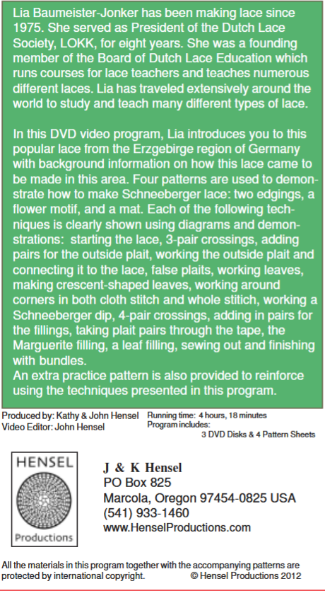 This DVD will show you how using colors can transform a simple Torchon pattern and provide endless possibilities for experimentation. The first two patterns are designed to show how pairs move through the lace when using different stitches and techniques. This knowledge is then used to control where the colors move in the following three patterns for an edging, a square mat and a bookmark. An additional pattern for a square mat is also included. The instructions assume that you know how to wind bobbins, make a pricking and work the basic stitches. However, starting and finishing, working ground stitches, spiders, cloth-stitch diamonds, roseground, footside edge and two different fans are all explained step by step.